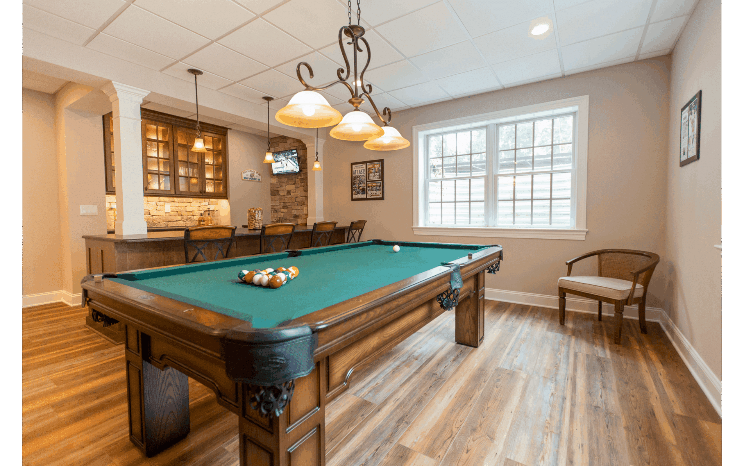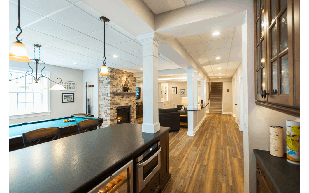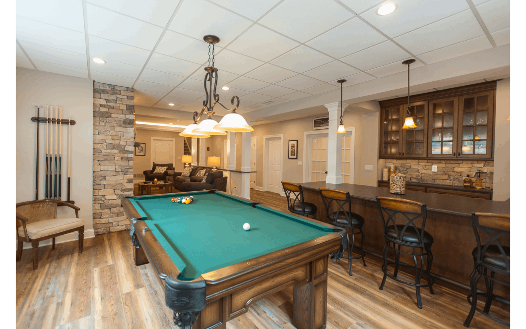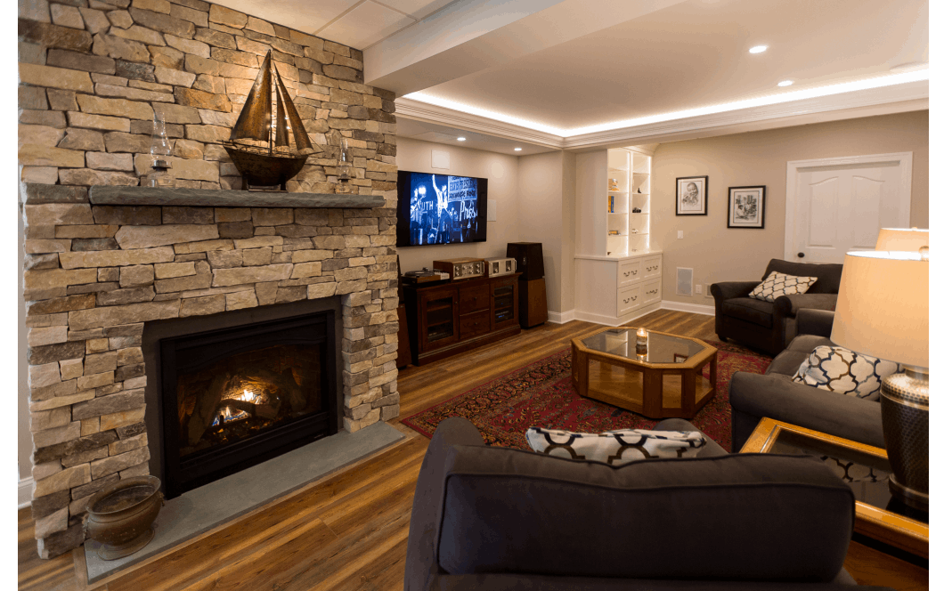 This Finished Basement in Hatfield, PA captures the homeowner’s vision of an in-home Irish pub. This expansive basement has many features designed specifically for the customer’s needs—including special lighted displays for his model trains, custom-depth drawers to store his extensive record collection, and an accessible bathroom. The stone fireplace and sports bar backsplash give this spacious basement just the right amount of rustic, cozy feel. Design and Construction by Meridian.