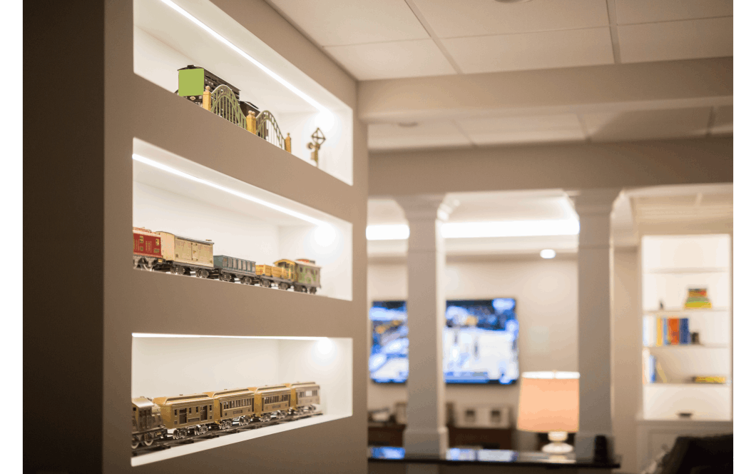 We were also impressed with Meridian efforts during this project. First, we have a physically challenged grandson (muscular dystrophy) who we want to be able to accommodate inthe basement area. Larry and Austin took care of details, such as the design of a handicapped-accessible bathroom and shower area, and the reinforcement of one set of steps to accommodate a chair lift for installation at a later date. Second, we have several antique model trains that we wanted to display. Larry and Austin suggested in-wall shelving with backlighting in the hallway, which turned out wonderfully. Third, we wanted a state-of-the-art, in-wall home theater system in the entertainment area. We had a local audio shop in mind for the installation and were pleased to hear that Meridian already had a great working relationship with them. The two companies collaborated to make the entertainment area a total success.